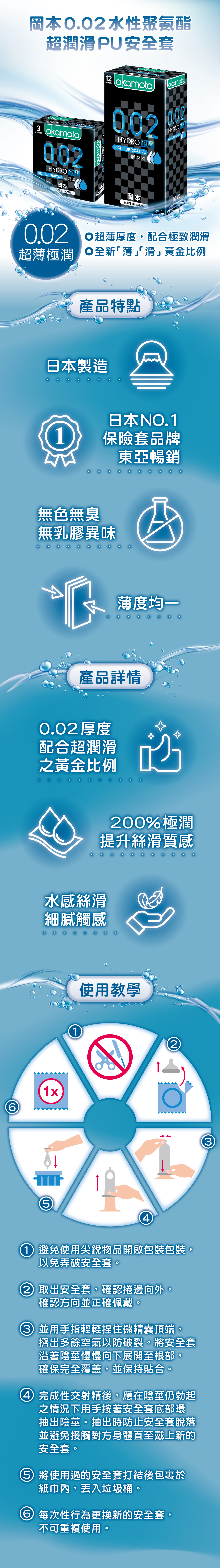 岡本 0.02 水性聚氨酯超潤滑 12片裝 PU 安全套是2025年新推出的產品,具備 200% 的豐富潤滑性,使質感光滑如絲。適合追求極致絲滑感的用戶。