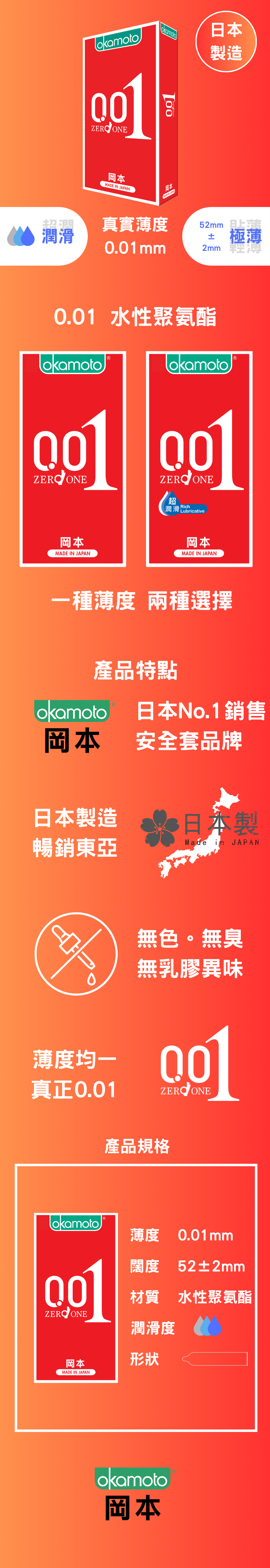 岡本 0.01 系列旨在追求超薄的質感,具有極佳的延伸性。0.01 毫米 的超薄設計能夠很好地感受到伴侶的體溫。
