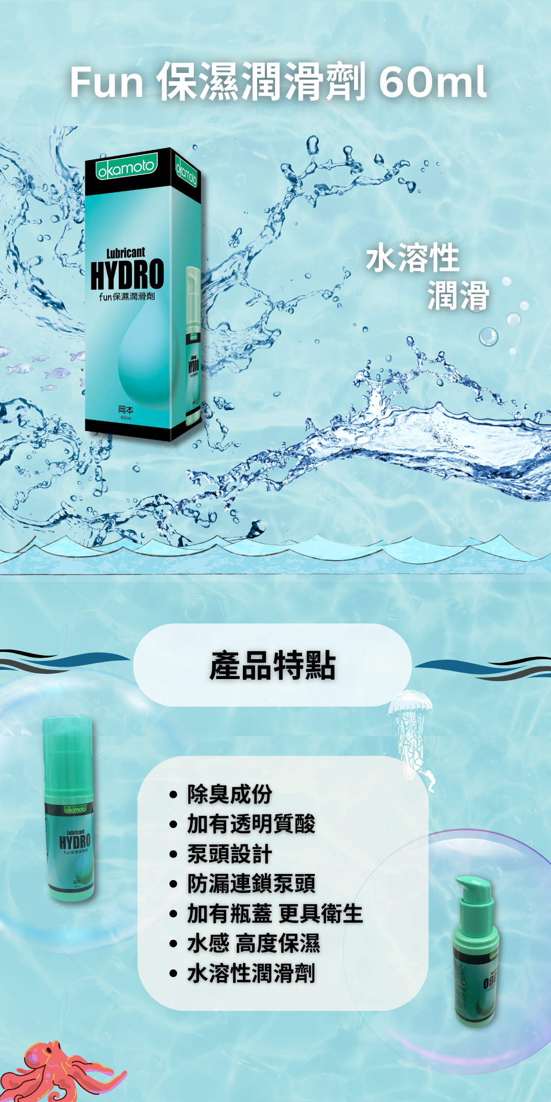 塗抹在身體任何需要潤滑的部位,這個產品是水溶性潤滑劑,可以用它來搭配岡本的避孕套。