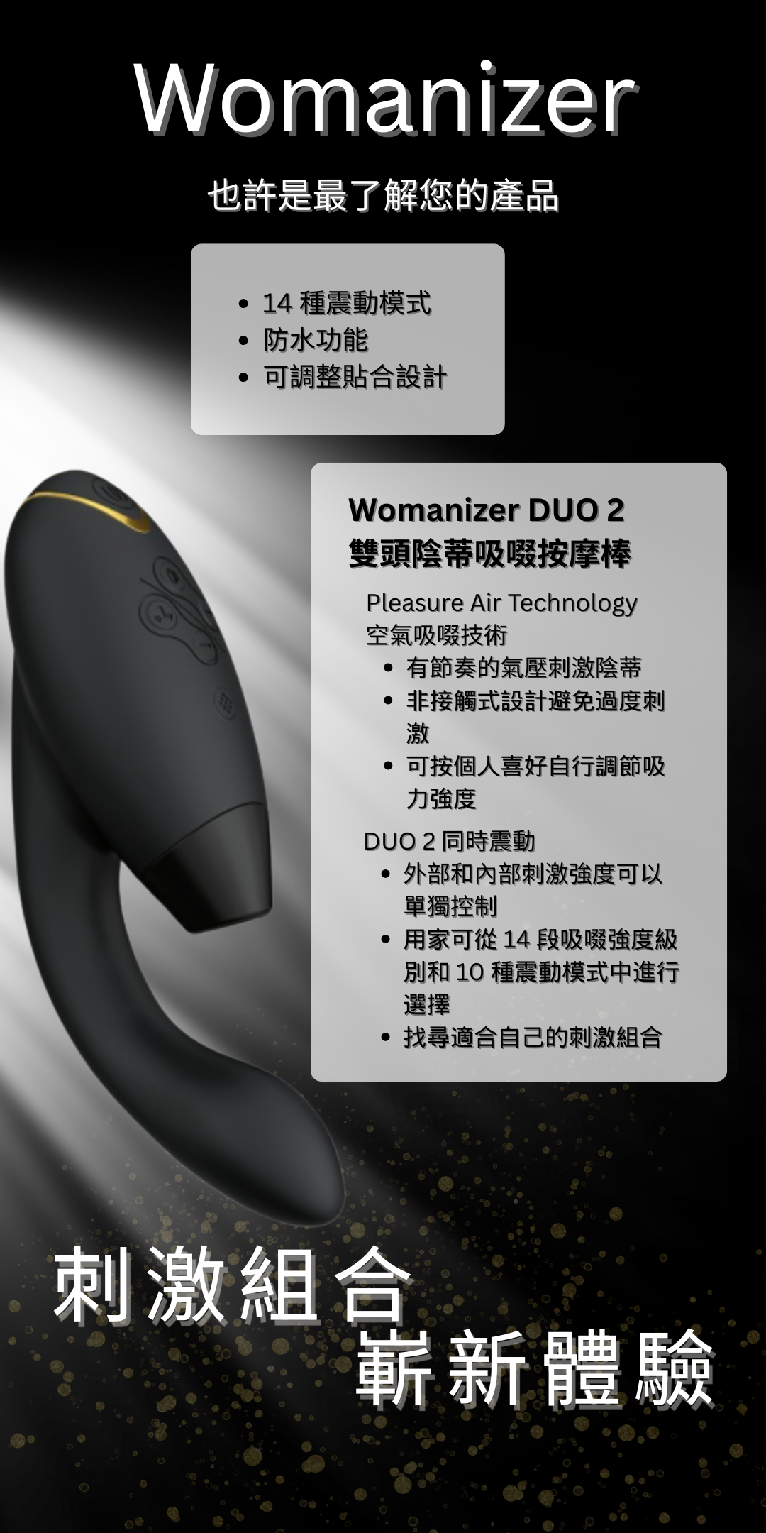 Womanizer DUO 2 擁有 14 段震動強度與 10 種模式的獨立控制,具備防水功能且設計靈活,可調整貼合度。